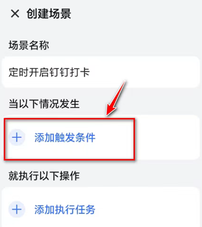 首先在“场景名称”下面的输入框输入文字,命名要创建的智慧场景名称为“定时开启钉钉”: