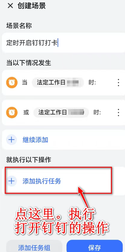 选择好之后,返回下面界面,这就是所有的这个智慧场景设置的主界面啦,在其上仔细检查,确认无误,记得点击下面的“保存”按钮,把辛辛苦苦设置的“定时开启钉钉打卡”的智慧场景添加到我的智慧场景中,让它发挥出力量吧。