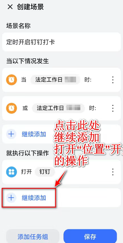 但是这样不行,还没完,需要第四,此时还需要手机自动打开“位置”开关,为钉钉提供“位置”信息啊,否则自动打卡的操作就会中断,自动打卡失败。具体的操作就是点击“就执行以下操作”下方的“继续添加”按钮,添加自动打开“位置”开关的操作。