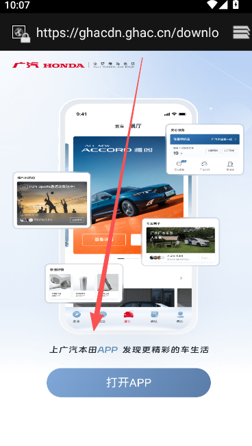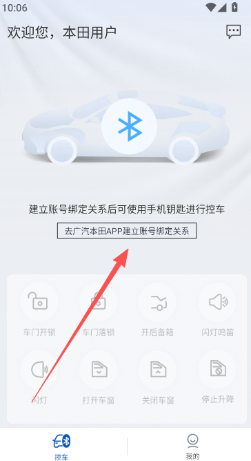 2、如图示前往广汽本田APP建立账号绑定关系,进行云钥匙的激活连接操作。