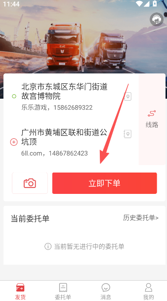 2、在发货功能版块,点击立即下单开始发布货源订单任务。