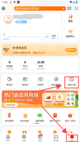 2、访问右下角【我的】界面,点击其中的【全部订单】功能