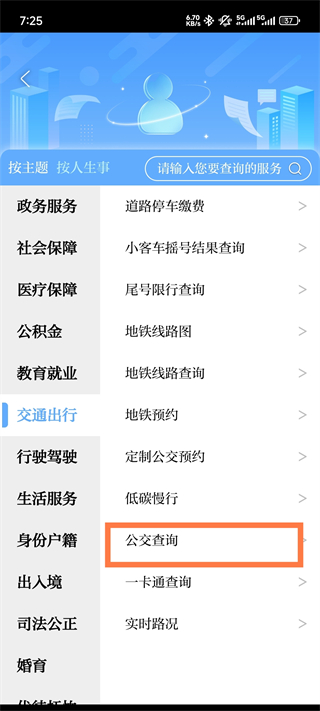 4、除了看直播质询新闻看报之外,软件内还有服务板块【这边以出行为例】