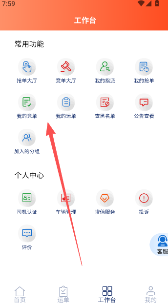 3、工作台,以常用功能和个人中心为主,主要集中了所有的使用部分,像常用到的抢单、竞单或是车辆管理相关,都可以在此完成。