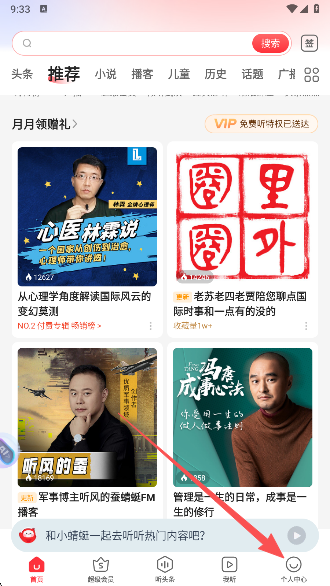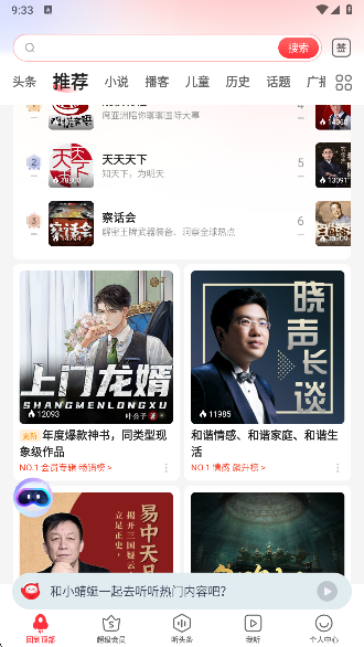 3、在首页提供了小说、评书、直播、历史、头条等分类;