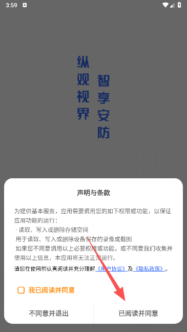 1、登录很简单的,大家直接打开同意宝技安防app的用户协议