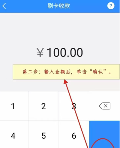 ①.在APP【收款】模块中选择【消费】,进入后输入刷卡金额,点击确认交易,此时手机上会提示“请刷卡/插卡”;
