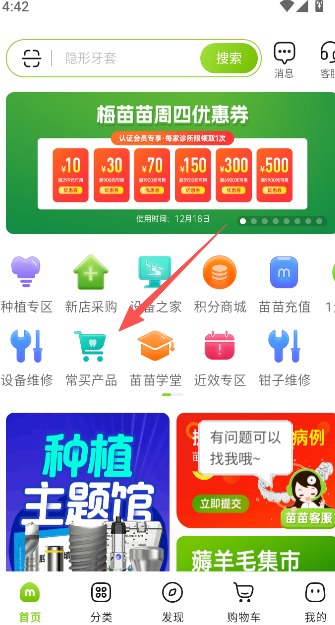 1、梅苗苗商城客服主要集中在首页,点击下方的苗苗客服进入客服沟通。