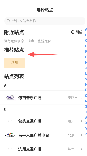 1、选择当前所在城市附近站点,加入FM广播电台。