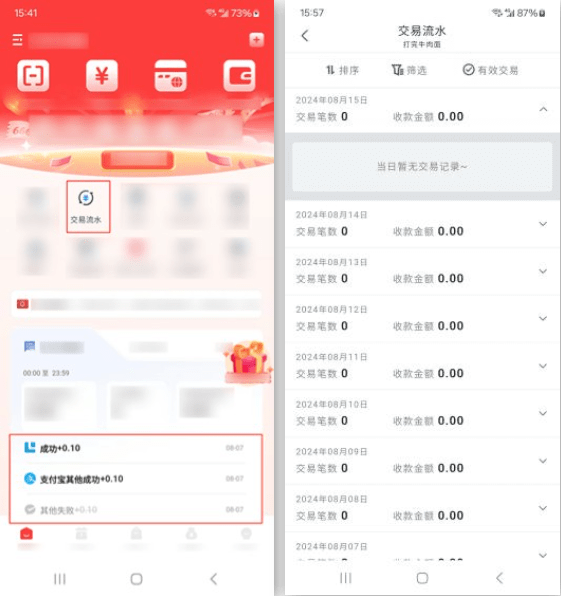 *支持根据付款方式、交易状态、收款工具、交易类型多维度,查询筛选时间内的交易流水情况