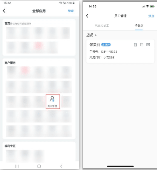 支持添加和查看店长和店员,新添加的角色需下载拉卡拉app实名认证完成激活店长主要权限: