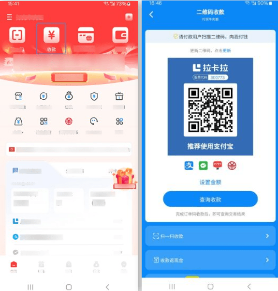 拉卡拉APP首页点击【收款】可至此页面,支持【扫一扫收款】和【二维码收款】