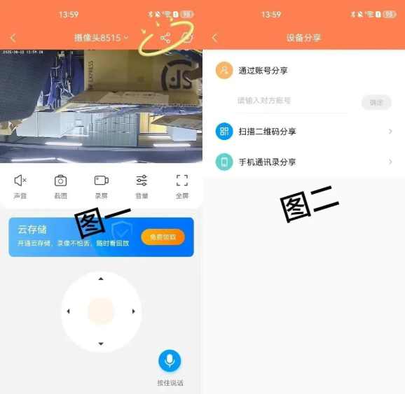 家人需要提前下载好喵眼精灵APP,并注册账号。如图一所示,先点击右上角分享图标,进入图二界面,通过以下三种方式分享给家人共享监控:1)通过输入家人的账号分享;2)通过扫描家人的账号二维码分享,二维码获取途径:【我的】-【个人信息】-【用户二维码】;3)手机通讯录分享,开启通讯录权限后,分享给家人。