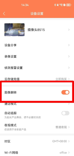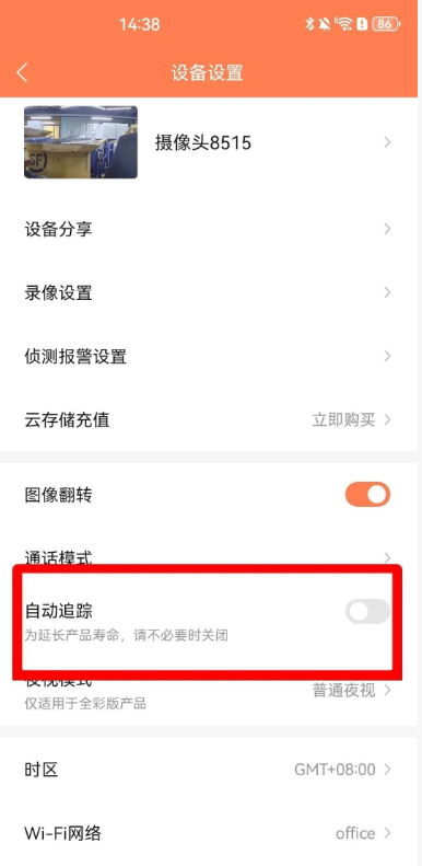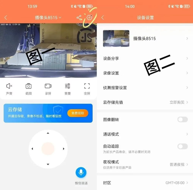 点击图一右上角图标,即可进入图二进行设备设置。在设备设置界面可以做以下设置:设备分享、录像设置、侦测报警设置、云存储充值、图像翻转、通话模式、自动追踪、夜视模式、时区、WiFi网络、设备参数、固件版本号。