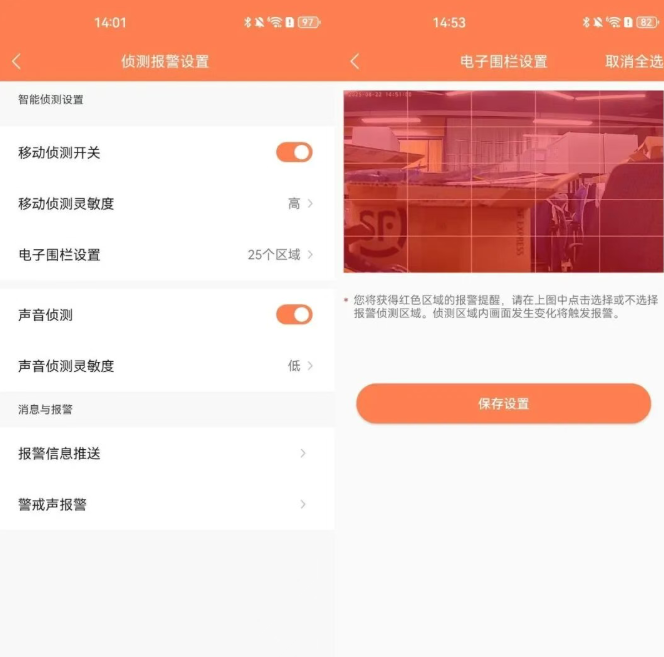 侦测报警设置打开后,报警消息推送也进入设置下,即可收到报警消息了,可及时查看。【警戒声报警】是指当人走近时,摄像头会发出声音,请谨慎设置。电子围栏设置:将监控画面划分成25个区域,可根据自己的需求点击选择或不选择报警侦测区域。如果选择设置后,侦测区域内画面发生变化将触发报警。