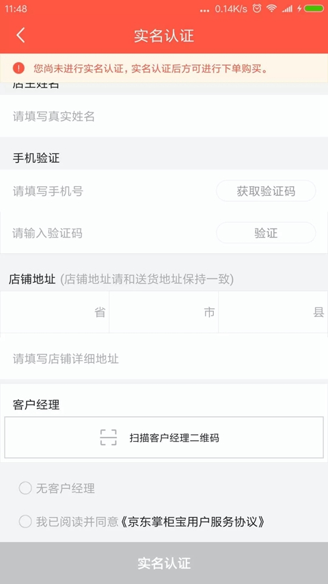 2、实名认证:请填写自己的真实姓名,店主姓名,和店铺地址,必须完善所需填充的资料。