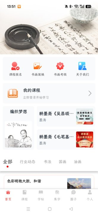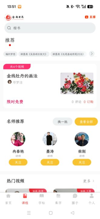 2、在之后来到应用首页界面, 可以开始各项书法专业类的课程学习。