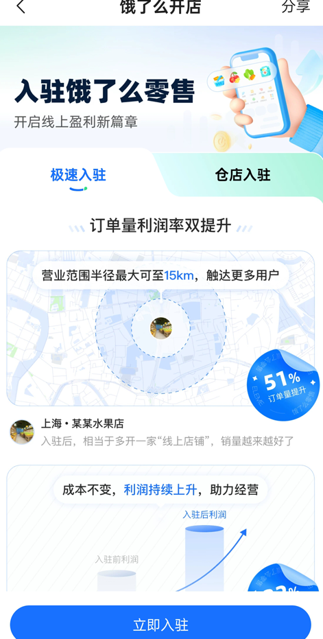 3、确认门店类型后,点击“立即入驻”进入资料填写流程