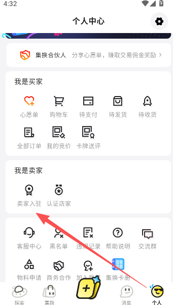 1、点击个人栏目找到我是卖家功能选项下方的卖家入驻。