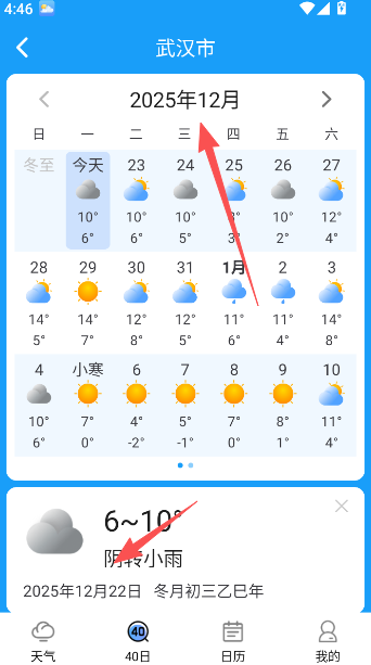 3、在40日预报中,可以查看当前城市所在的40天内的气象情况,方便大家查看规划出行计划。