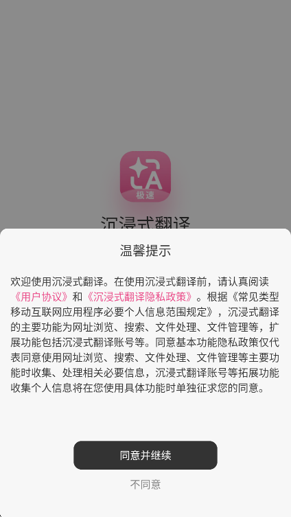 1、在本站下载安装沉浸式翻译app打开,同意用户协议