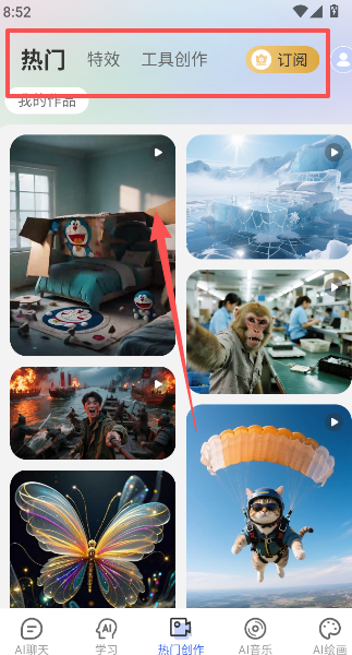 4、热门创作,针对用户们的特效工具创作需求,都有免费模板提供给大家,选择配置预览,感受不一样的AI精彩体验。