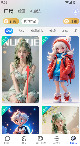 6、AI绘画,精选多个不同类型的模板,定义自己或是他人的AI虚拟形象,打造出全新的绘画人物。
