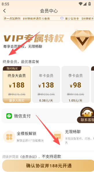2、支付188元费用以后,点击下方确认协议选项,完成开通操作。