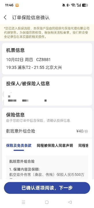 4、选择符合你出行需求的下单,下单前仔细查看订单保险信息确认选项,逐项阅读确认无误后点击“下一步”。