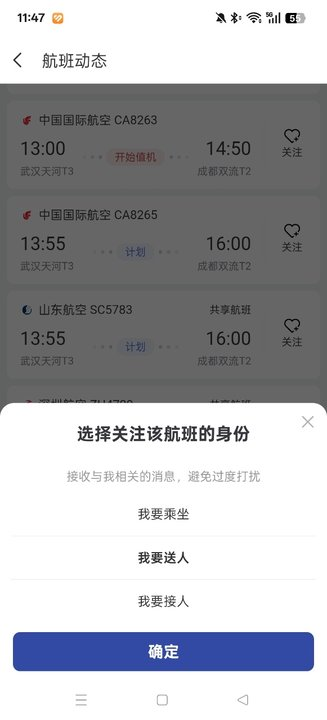 3、选择关注该次航班的身份,完成后点击航班信息明细后的爱心完成关注的添加。