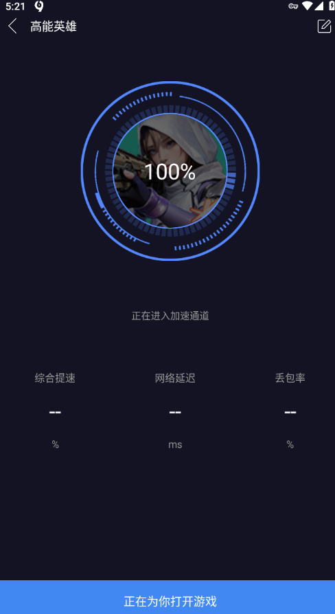 5.如下图所示,正在为我们打开通道,显示为100%的时候,页面就会跳转,我们就可以玩加速的游戏了。