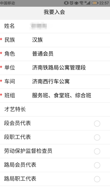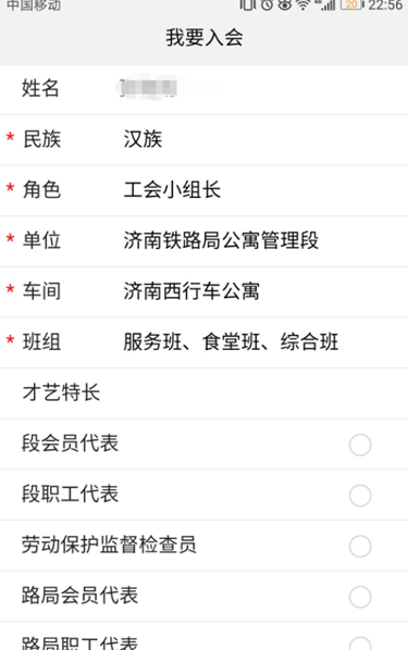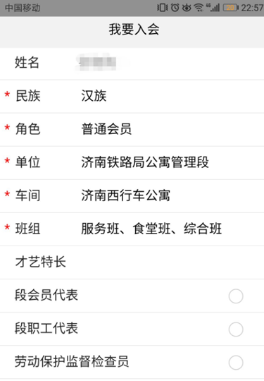 2、填写入会信息,其中红色星号*为必填项。填写完毕后点击下方“提交”按钮。 车间工会主席和车间主任只需填写:“民族、角色、单位、车间”4项内容; 车间工会小组长和普通会员需填写:“民族、角色、单位、车间、班组”5项内容。