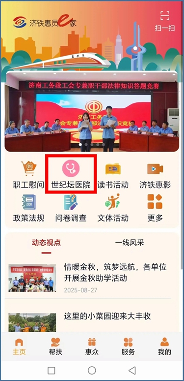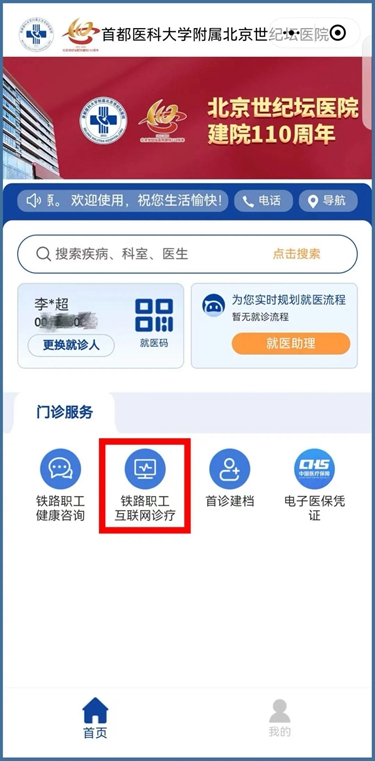 1、登录济铁惠员e家APP,在主页选择“世纪坛医院”,阅读用户须知并勾选同意后点击“进入服务”,根据需求选择“铁路职工健康咨询”或“铁路职工互联网诊疗”。具体操作流程如下: