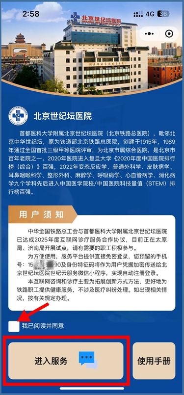 3、 阅读用户须知并勾选“我已阅读并同意”,点击“进入服务”进入铁路职工互联网健康咨询诊疗服务页面。