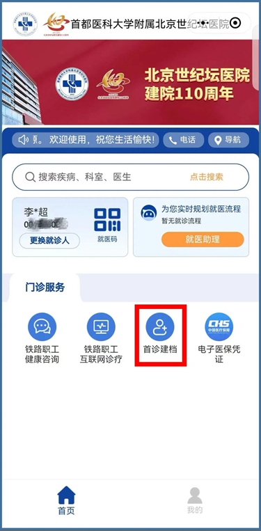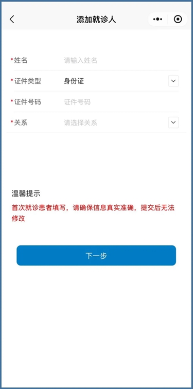 4、首次登录须点击“首诊建档”,以身份证信息完成实名认证(非首次登录可跳过此步骤)。如实填写姓名、证件号码,“关系”选项选择“本人”。