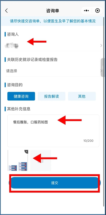6、填写咨询单并提交,可以文字、图片和语音形式进行交流,医生将于12小时内完成回复。