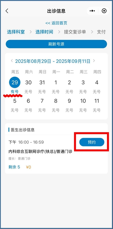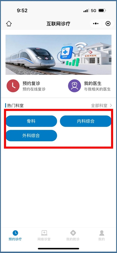 7、 【互联网诊疗】选择“铁路职工互联网诊疗”—选择就诊科室—选择诊疗时间—点击“预约”。