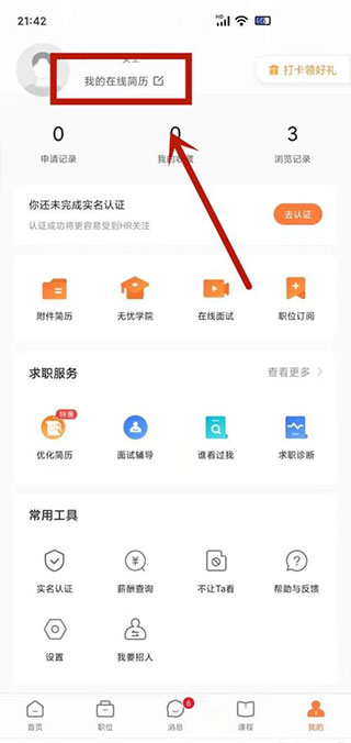 1、打前程无忧51Job后,点击首页右下角的我的,进入后,点击最上方我的在线简历。