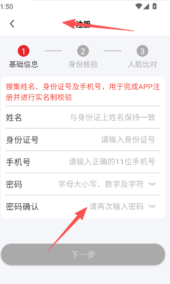 2、输入基础信息,点击身份核验并完成人脸认证识别以后注册成功。