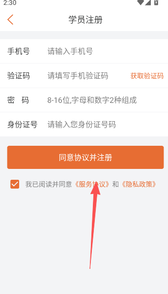 3、完整填写学员注册信息部分,点击同意协议并注册进入。