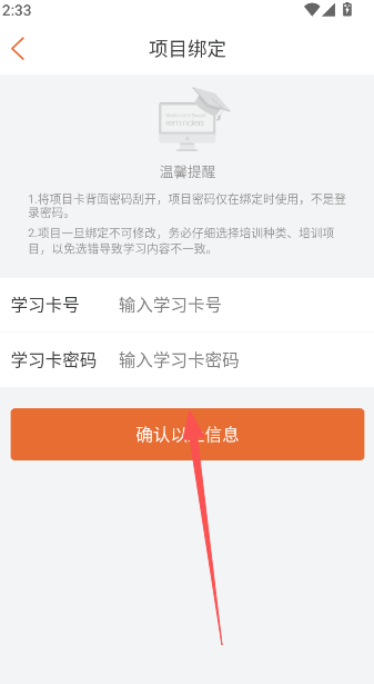 5、如有购买课程,请在项目绑定中,输入学习卡号和密码,完成操作。