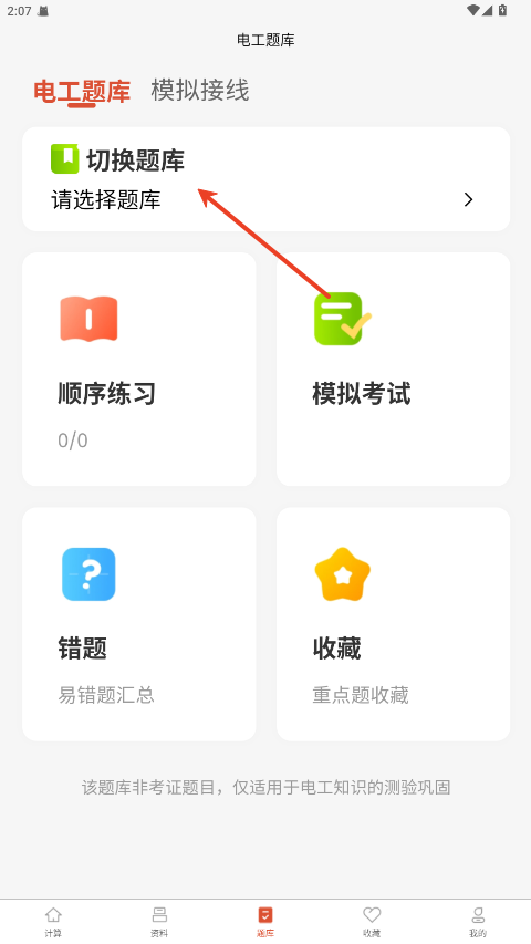 4.进入 “考试题库”,选择 “切换题库” 选择对应工种,按章节做专项练习,巩固考点知识。