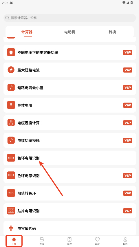 2.进入 “电工计算器”,选择你需要的小工具,例如 “色环电阻识别”,输入色环颜色,一键获取电阻阻值与误差,快速判断电阻参数。