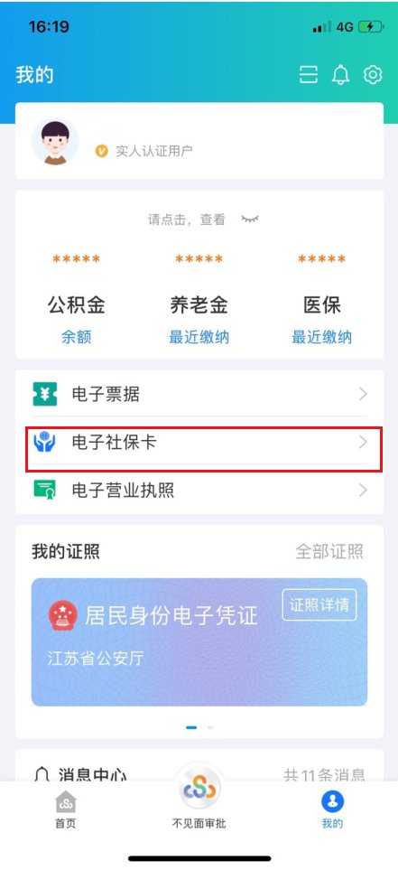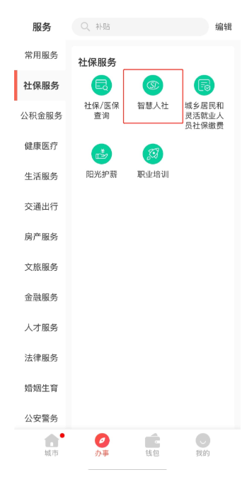 1、进入“我的南京”APP,点击“办事”—“社保服务”—“智慧人社”——“电子社保卡”;