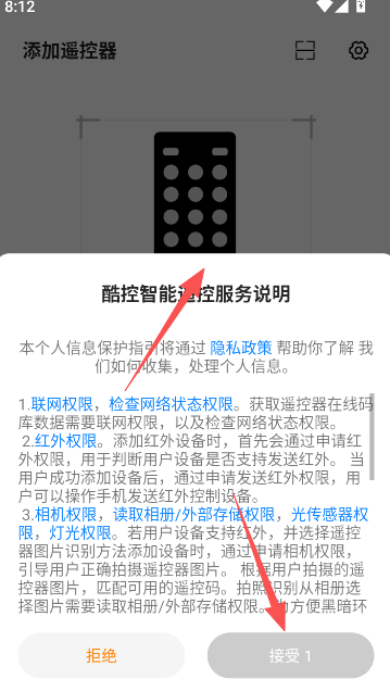 1、阅读酷控智能遥控服务说明内容部分,点击接受进入软件使用界面。