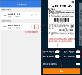 如果你使用的是网点电子面单,进入“快递单模板”--“设置模板”,参考下图设置隐私信息:
