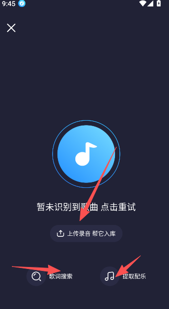 3、如果提示没有识别到歌曲来源,可点击重新识别,或是通过歌词搜索和提取配乐的方式识别。