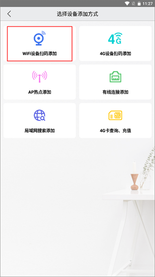 3、这里有很多种添加设备的方式,如WiFi设备扫码添加、4G设备扫码添加、AP热点添加、有线连接添加等
