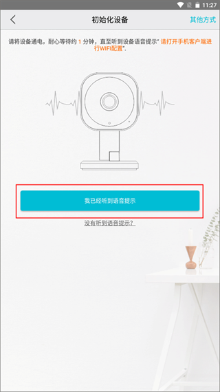 4、选择好添加方式后,根据上方的文字提示来听“请打开手机客户端进行WiFi设置”这几个语音提示,听到点击“我已经听到语音提示”按钮。