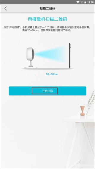 5、输入家中WiFi的密码并进入下一步,点击下方的“开始扫描”,这时手机屏幕上就会显示一个二维码,将摄像头对准手机屏幕一定距离,扫描成功后就可以添加成功了。